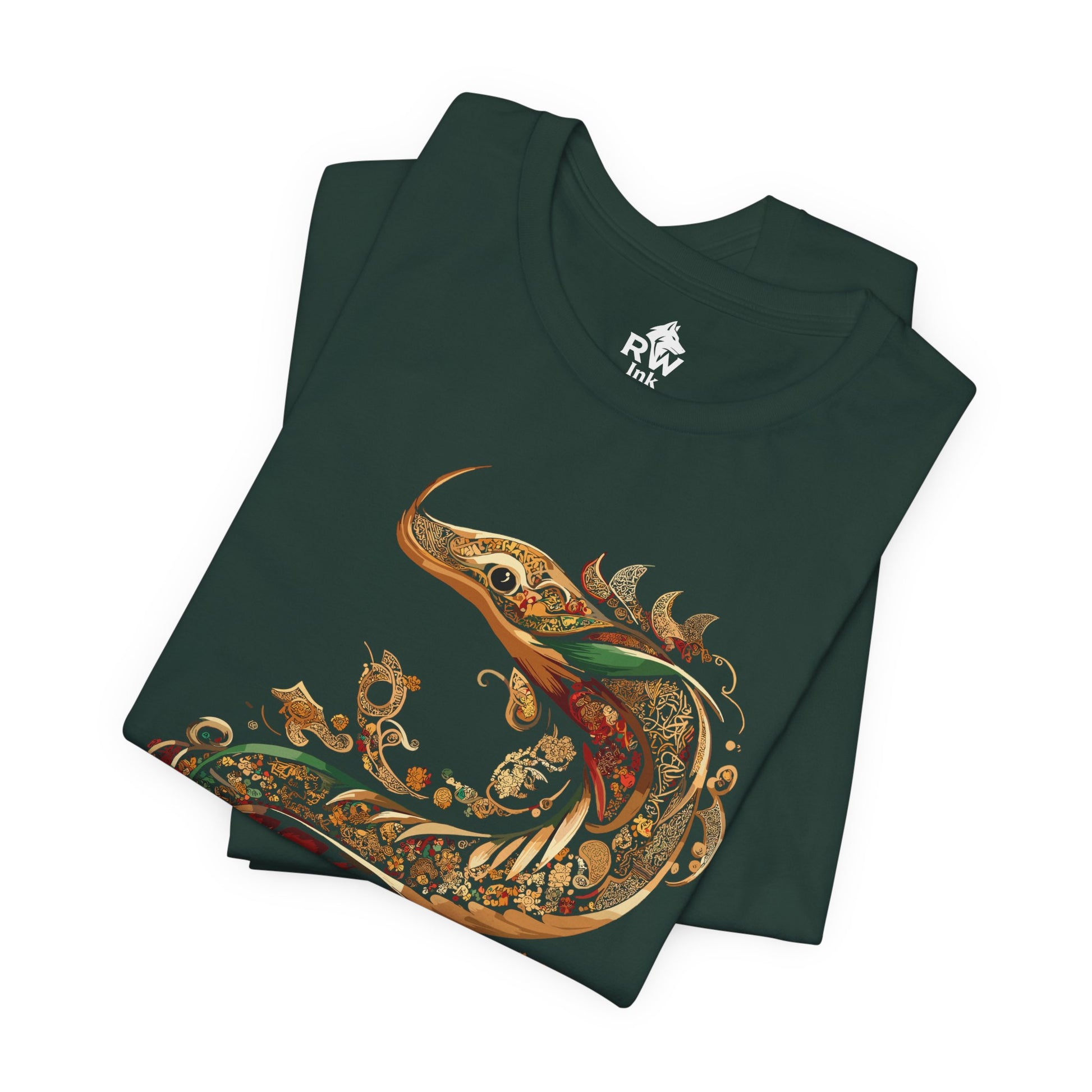 Embrace the mystique of this captivating Dragon design. Inspired by traditional Middle Eastern patterns and symbolism, this shirt features a coiled dragon composed of richly detailed calligraphy and ornamental motifs. A bold choice for art lovers, spiritual explorers, or cultural expression through wearable art.